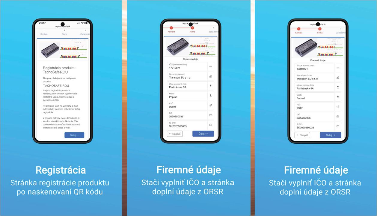 TS RDU po zakúpení treba zaregistrovať. Registrácia je jednoduchá, stačí načítať QR kód na jeho balení, vyplniť všetky údaje používateľa a do 24 hod (okrem dní pracovného pokoja) sú dostupné zakúpené funkcie a jeho webová platforma TS WEB BASIC/PRO (pokiaľ ešte nebola aktivovaná). Ukážka registrácie zákazníka cez mobilný telefón, registrácia je možná aj cez počítač.