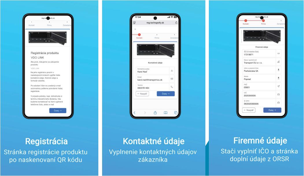 VDO LINK po zakúpení treba zaregistrovať. Registrácia je jednoduchá, stačí načítať QR kód na jeho balení, vyplniť všetky údaje používateľa a do 24 hod (okrem dní pracovného pokoja) sú dostupné zakúpenú funkcie a jeho webová platforma VDO FLEET. Ukážka registrácie zákazníka cez mobilný telefón, registrácia je možná aj cez počítač.